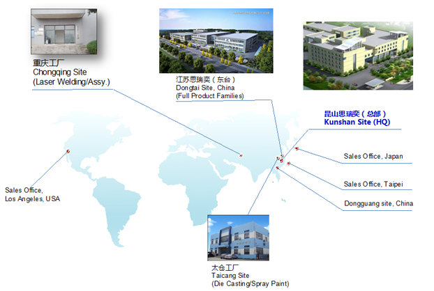 思瑞奕電子有限公司成立于2010年10月,注冊資金7500萬人民幣,總部位于江蘇省昆山市,在重慶、江蘇東臺、江蘇太倉設有分廠,公司于2011年通過ISO9001/ISO14001認證,2013年通過高新技術企業和TS16949(IATF)體系認定,2016年先后通過知識產權管理體系認證、安全生產標準化認證,2017年獲頒江蘇省民營科技企業、2018年先后獲得蘇州市人民政府認定企業技術中心、科技部認定中小型科技企業、江蘇省最具成長性高科技企業、2020年獲得江蘇省人民政府認定企業技術中心、2021年獲得蘇州市瞪羚計劃入庫企業、江蘇省省級工程技術研究中心、江蘇省專精特新中小企業等榮譽稱號......